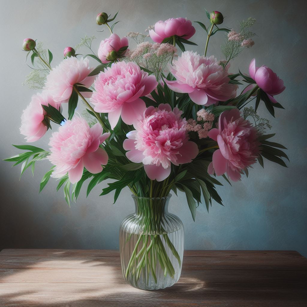 arrangement, beauty, bloom, bouquet, delicate, floral, flowers, gentle, glass, green, life, light, nature, peonies, pink, soft, still, table, vase, wood