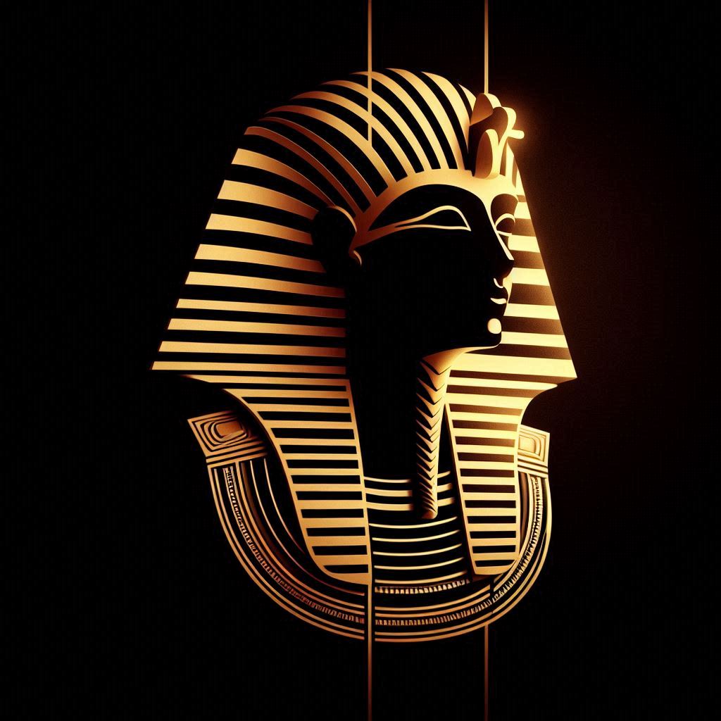 A golden mask of an ancient Egyptian pharaoh with a dark background.