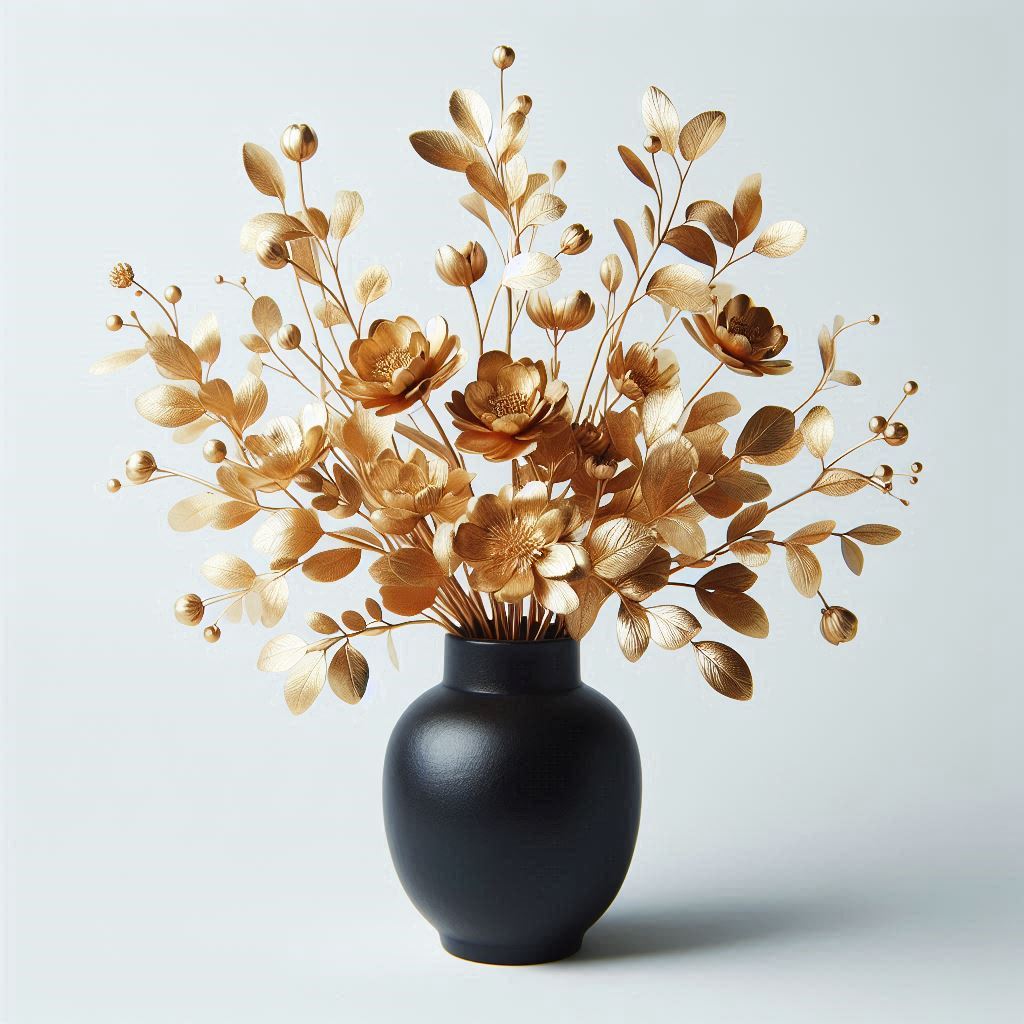 arrangement, beautiful, black, decor, decoration, elegant, floral, flowers, gold, golden, home, leaves, life, luxury, metallic, nature, shiny, stem, still, vase