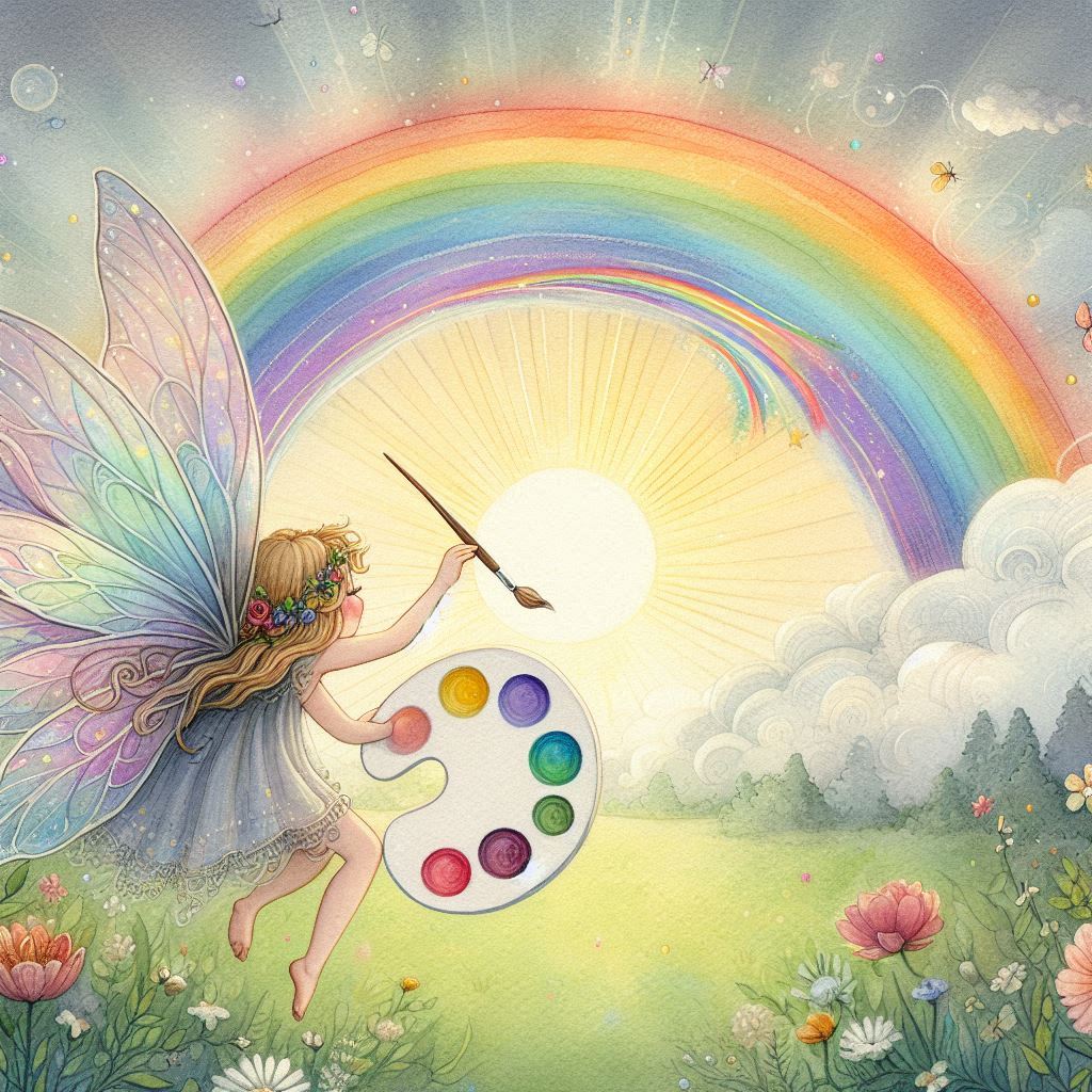 A fairy with wings and a paintbrush paints a rainbow in the sky with a palette of colorful paints.