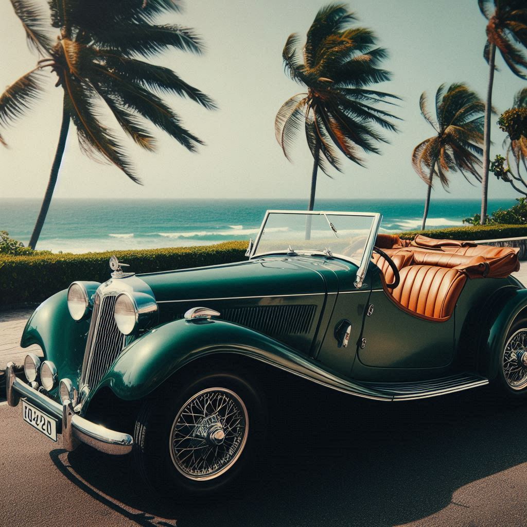 automobile, beach, brown, car, classic, coast, convertible, green, leather, ocean, old, palm, road, summer, sunshine, travel, trees, tropical, vacation, vintage