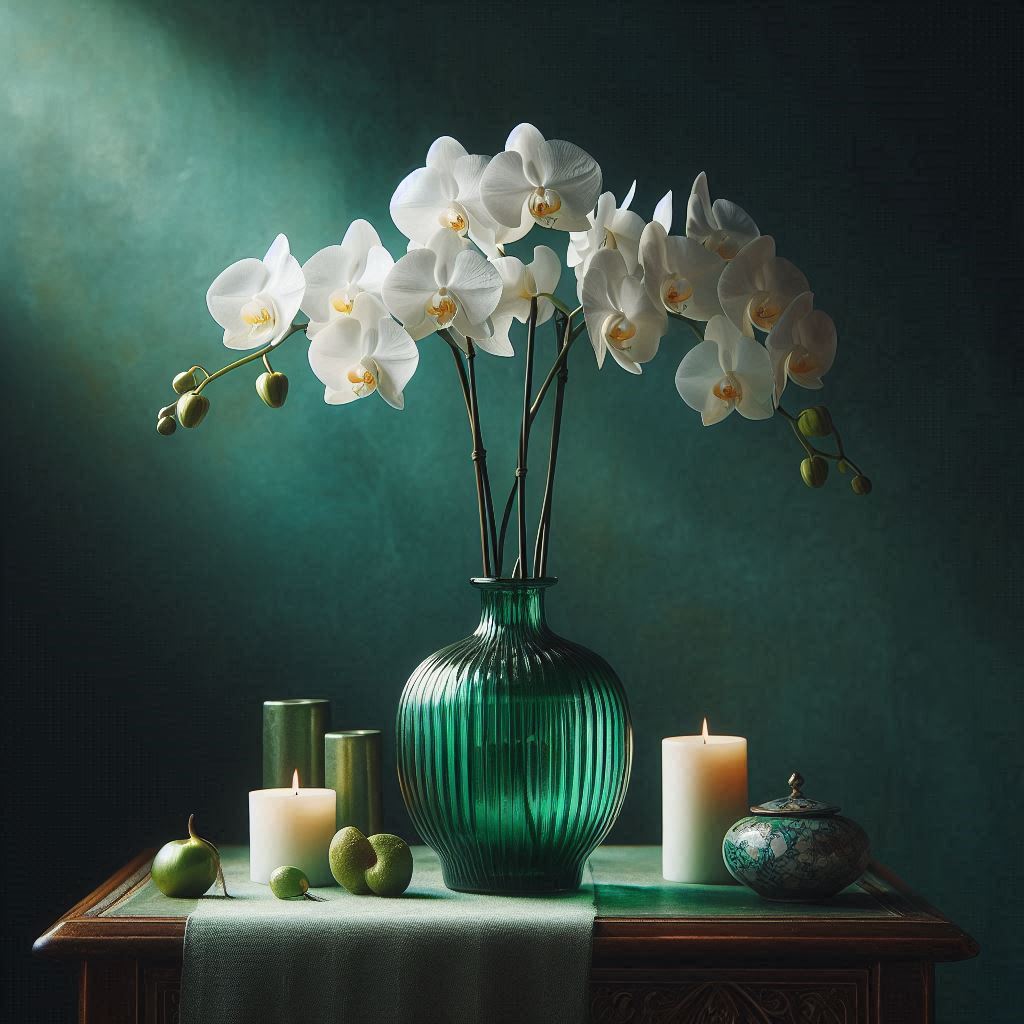 White orchids in a green vase sit on a table with candles and green apples, with a teal wall and a soft light in the background.