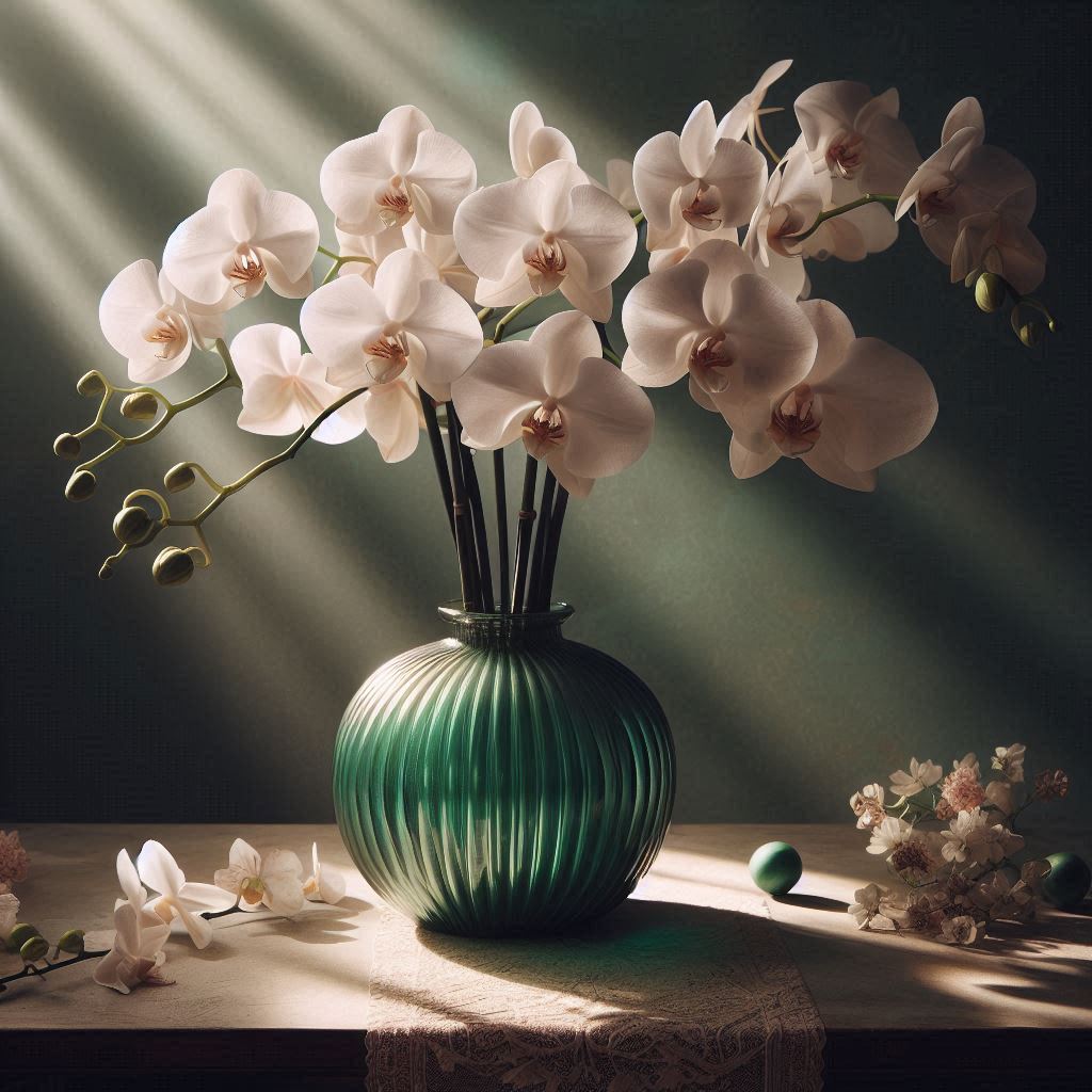 Sunlight streams through a window, illuminating white orchids arranged in a green vase on a table. Delicate lace accents the scene.