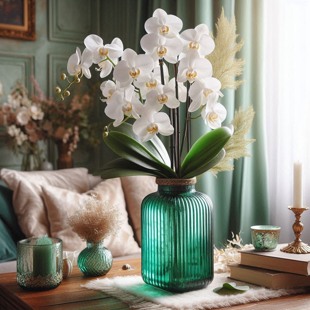 arrangement, books, bouquet, candles, decor, decoration, decorative, floral, flowers, green, home, interior, living, orchid, room, table, teal, vase, white, wooden