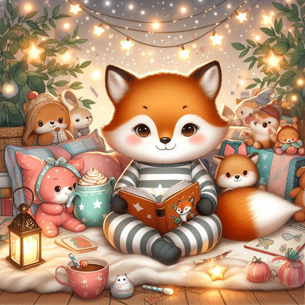 animal, blanket, book, christmas, comfy, cozy, cute, fox, happy, holiday, illustration, lights, night, pajamas, reading, relax, soft, toy, warm, winter