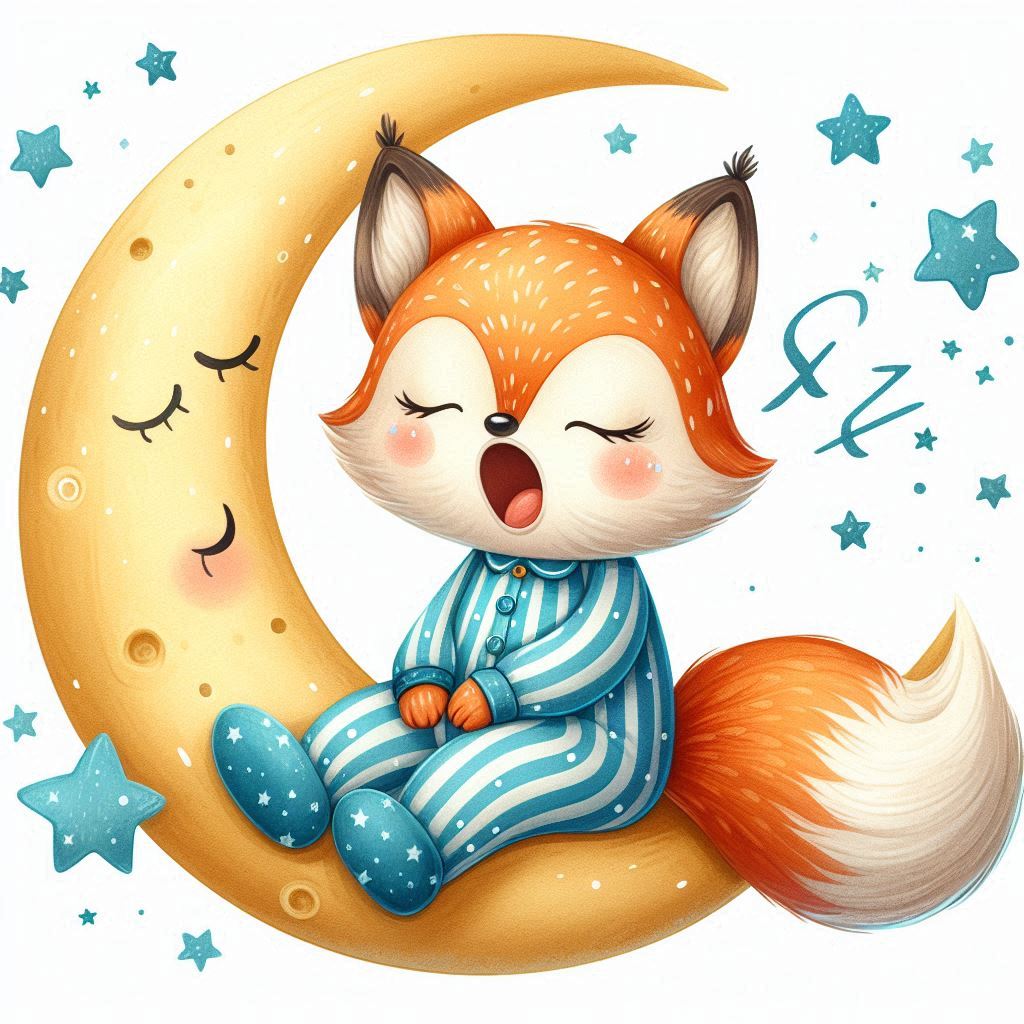 A cartoon fox wearing pajamas sits on a crescent moon, eyes closed and mouth open, as if yawning. Stars surround the moon and fox.