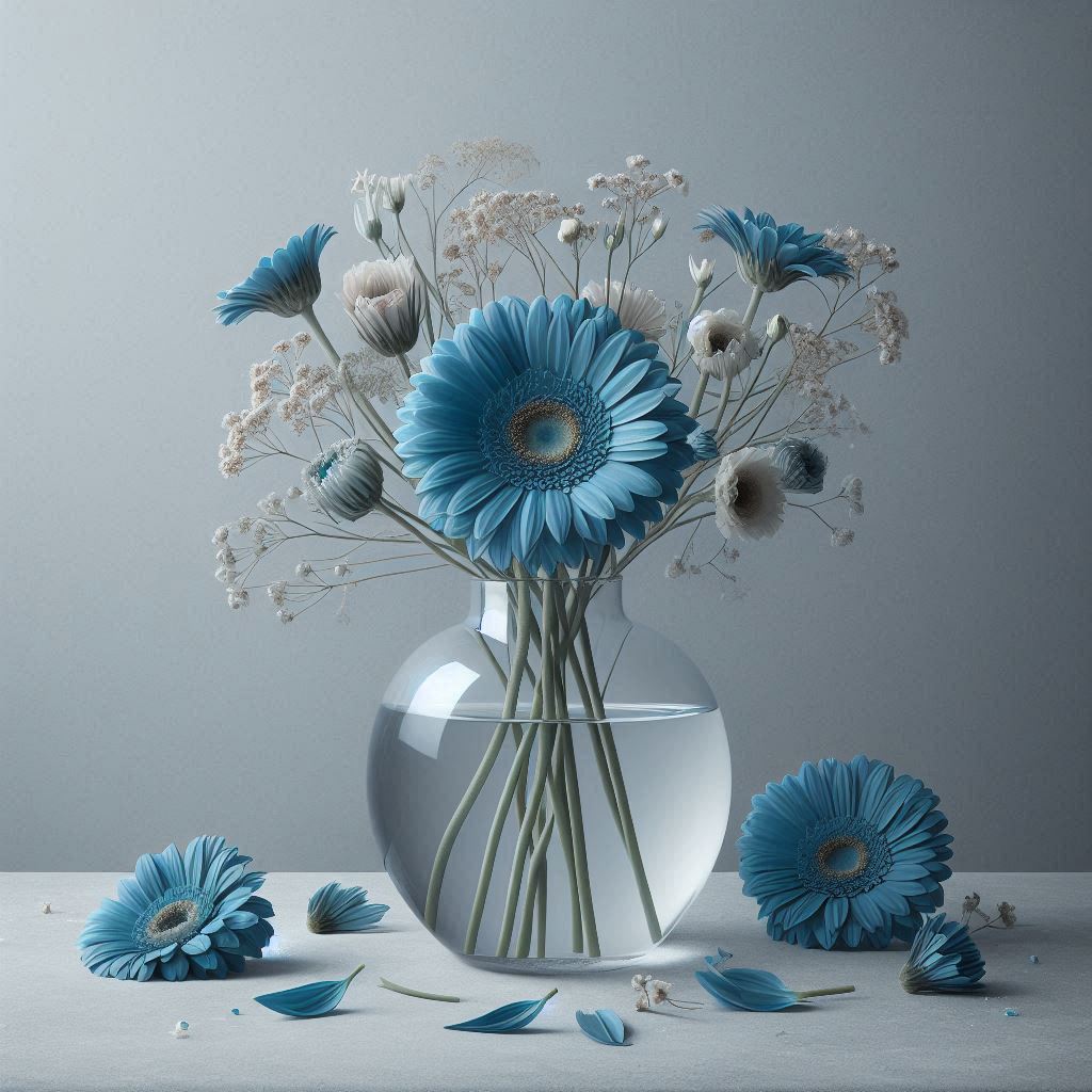 A bouquet of blue gerbera daisies and white baby's breath is arranged in a clear glass vase on a white table.