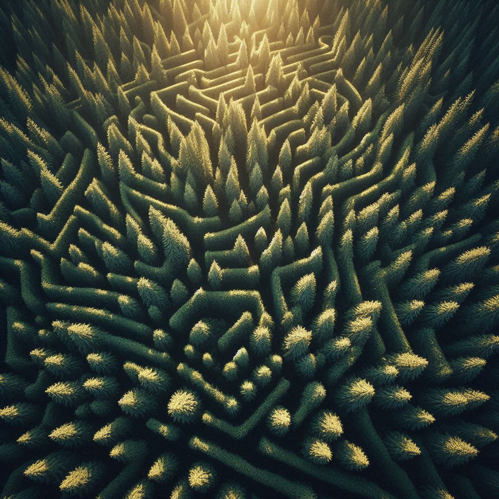 adventure, aerial, complex, design, exploration, forest, geometry, green, intricate, labyrinth, landscape, maze, nature, pathway, pattern, perspective, puzzle, sunlight, trees, view