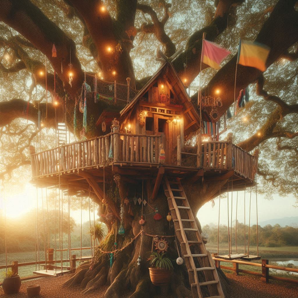 Treehouse with swings and lights at sunset