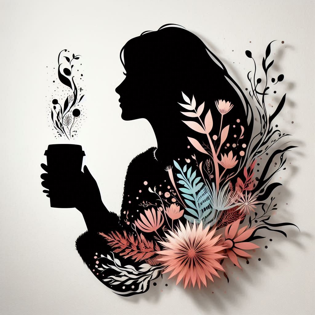 A black silhouette of a woman holding a cup of coffee with flower steam, surrounded by colorful paper flowers.