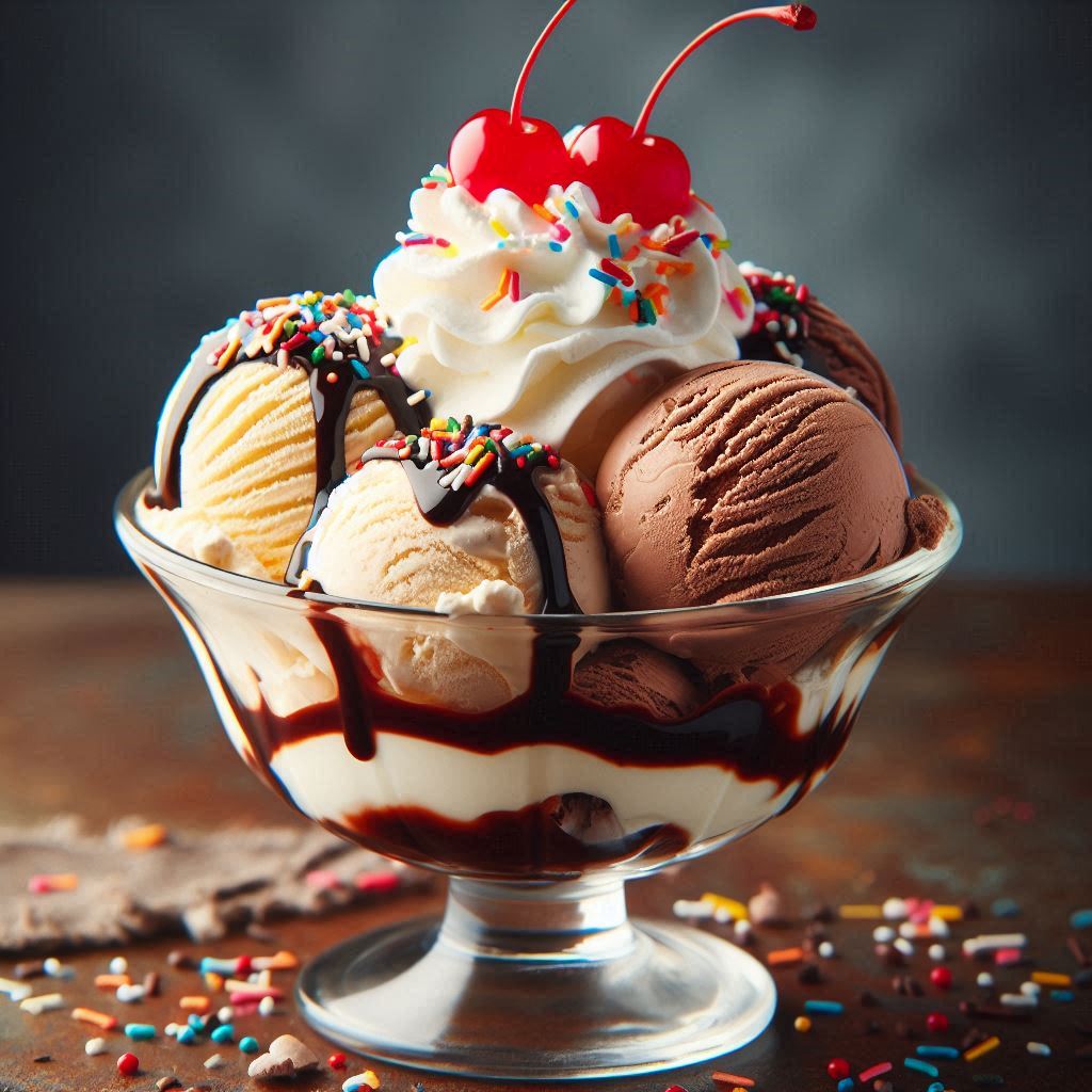 A classic sundae with vanilla and chocolate ice cream, whipped cream, cherries, and chocolate syrup.