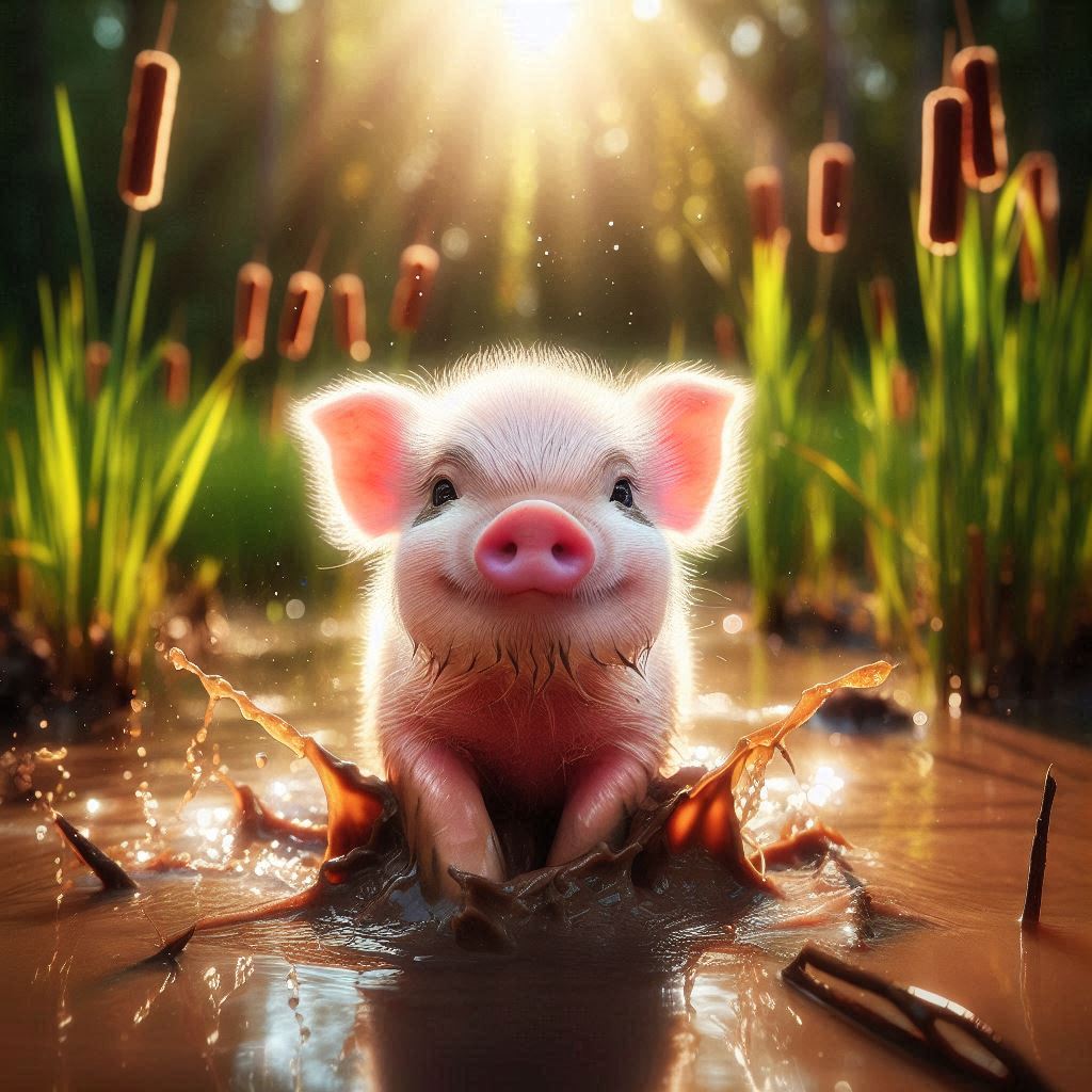 A happy piglet plays in a muddy puddle, surrounded by tall grass and sunlight.