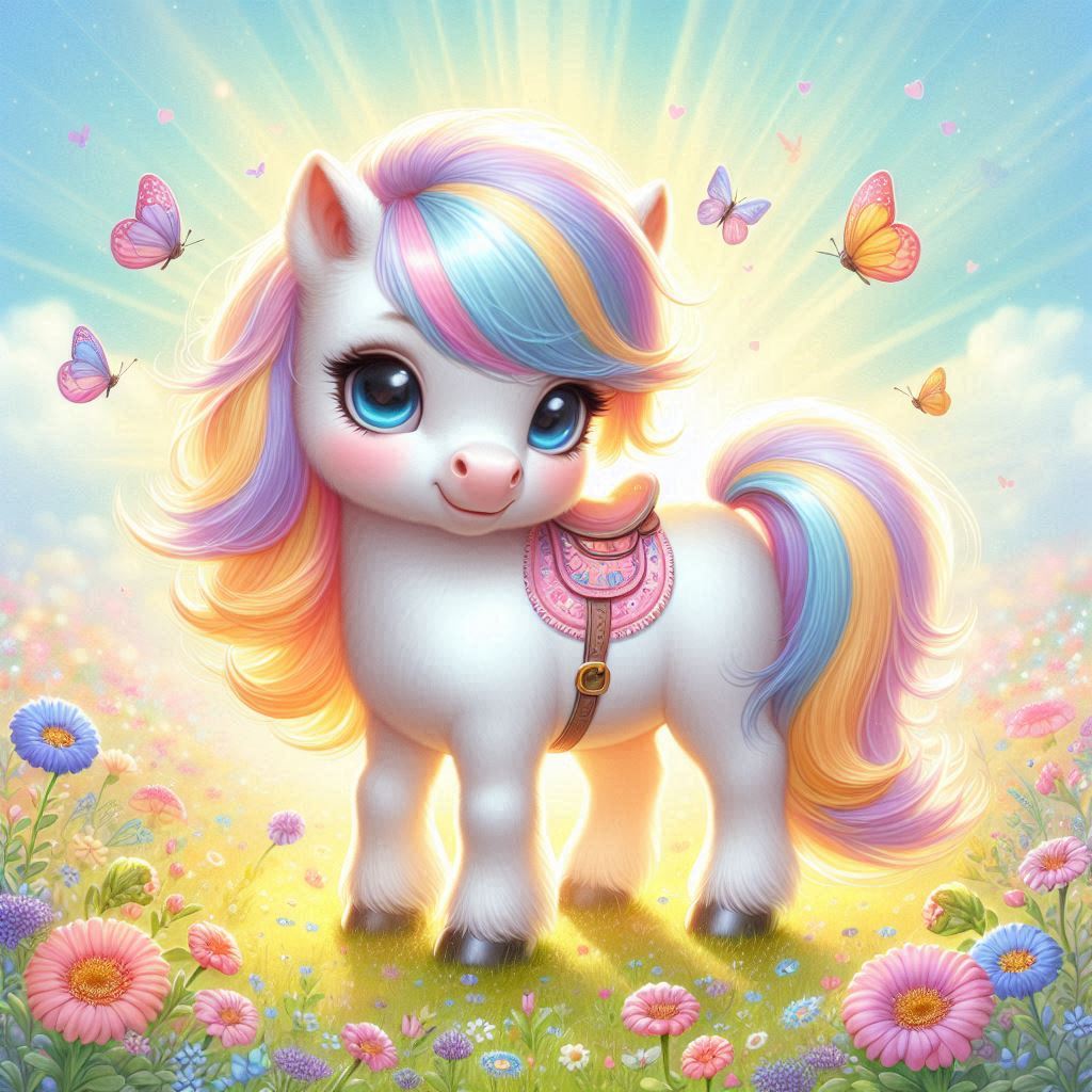 A white pony with rainbow-colored mane and tail stands in a field of flowers, with butterflies flying around.