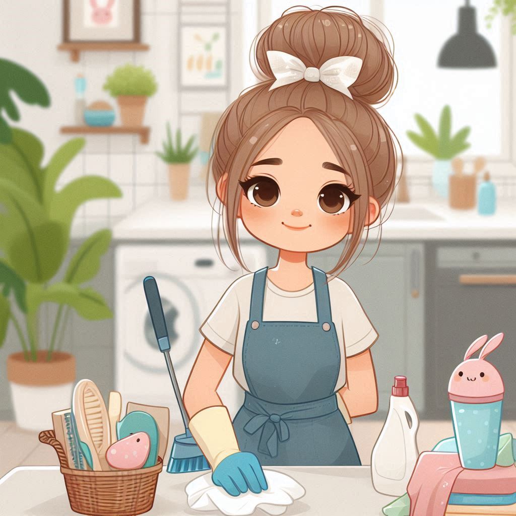 A cartoon girl in a blue apron cleans a kitchen counter with a white cloth and a blue glove.