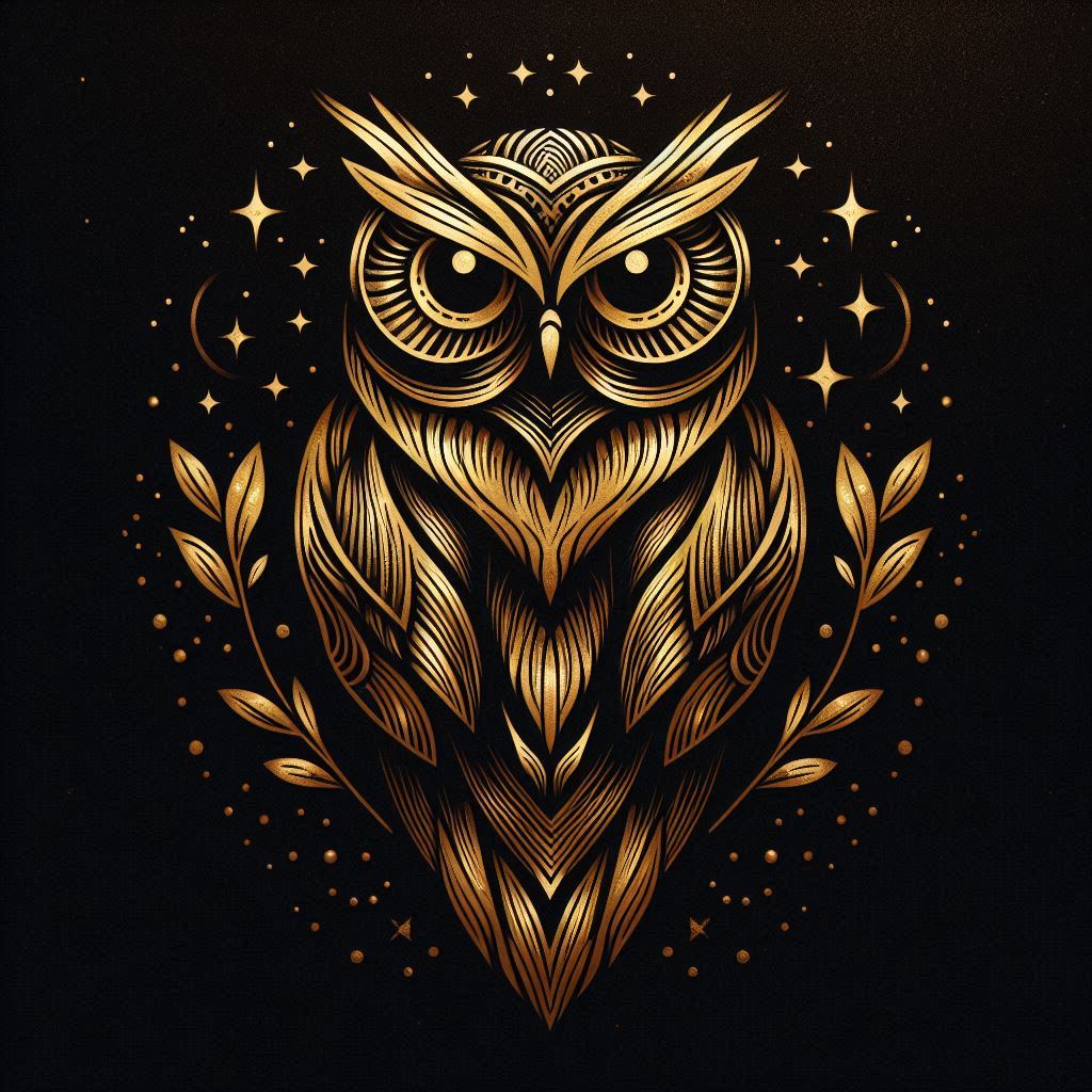 A detailed illustration of a golden owl against a black background, surrounded by stars and stylized branches.