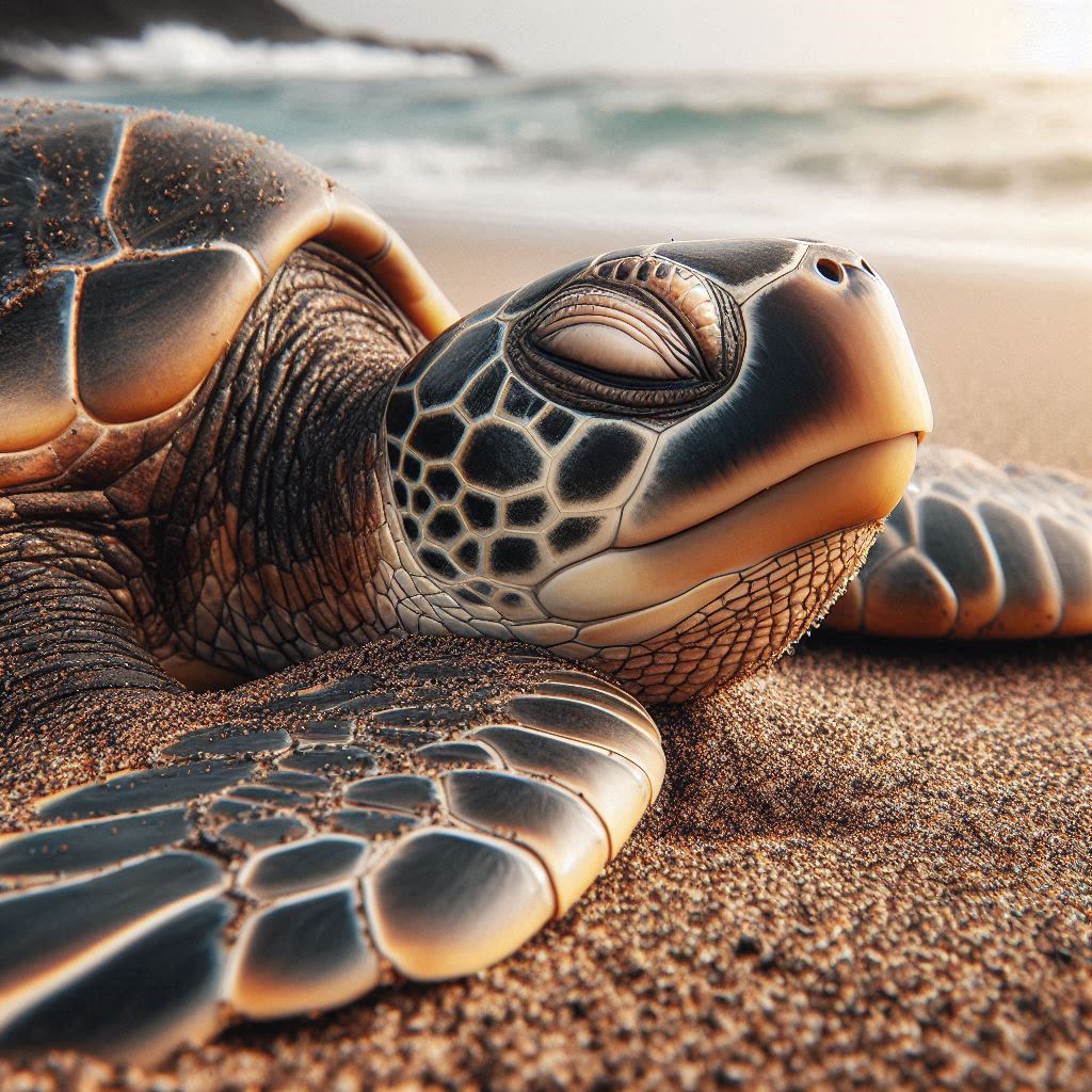 A sea turtle rests on a sandy beach with the ocean in the background.