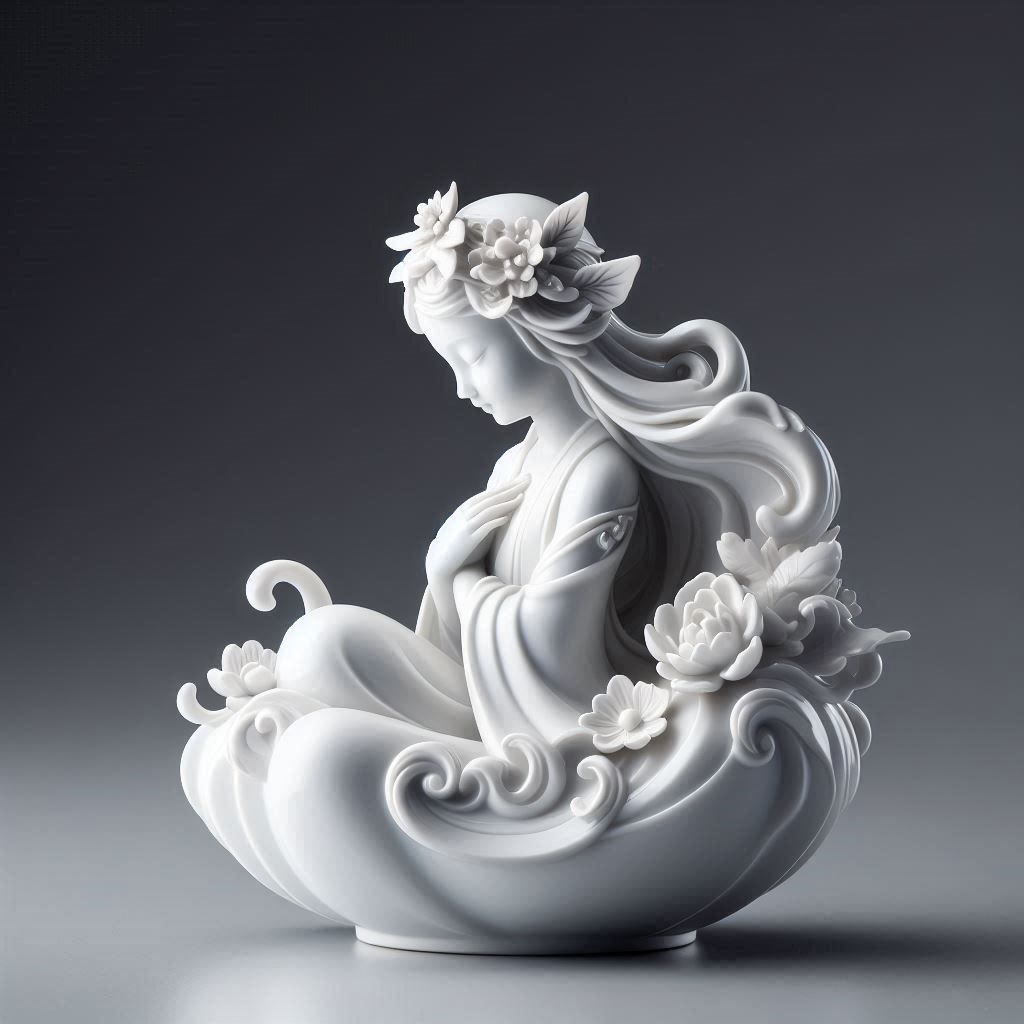 art, base, ceramic, chinese, cloud, collectible, crown, decorative, figurine, floral, flowers, hair, handmade, long, porcelain, sculpture, sitting, traditional, white, woman