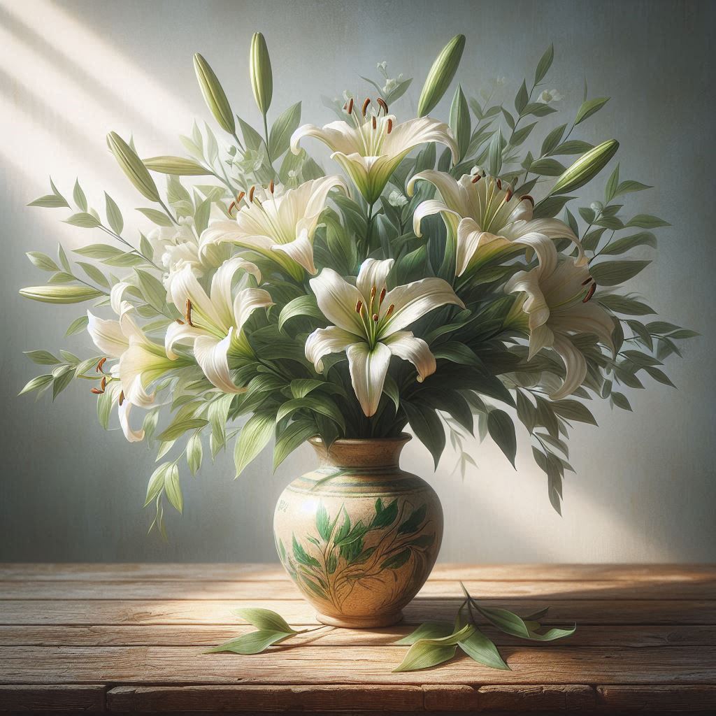 A bouquet of white lilies in a ceramic vase, illuminated by sunlight, rests on a wooden table.