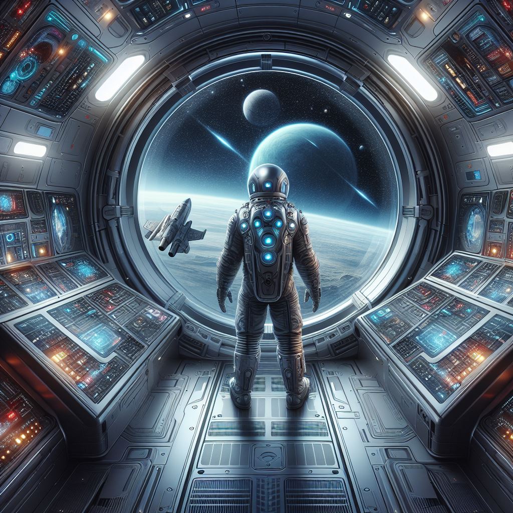 Astronaut in a spaceship stares out at a distant blue planet through a large window, surrounded by bright stars and a passing spaceship
