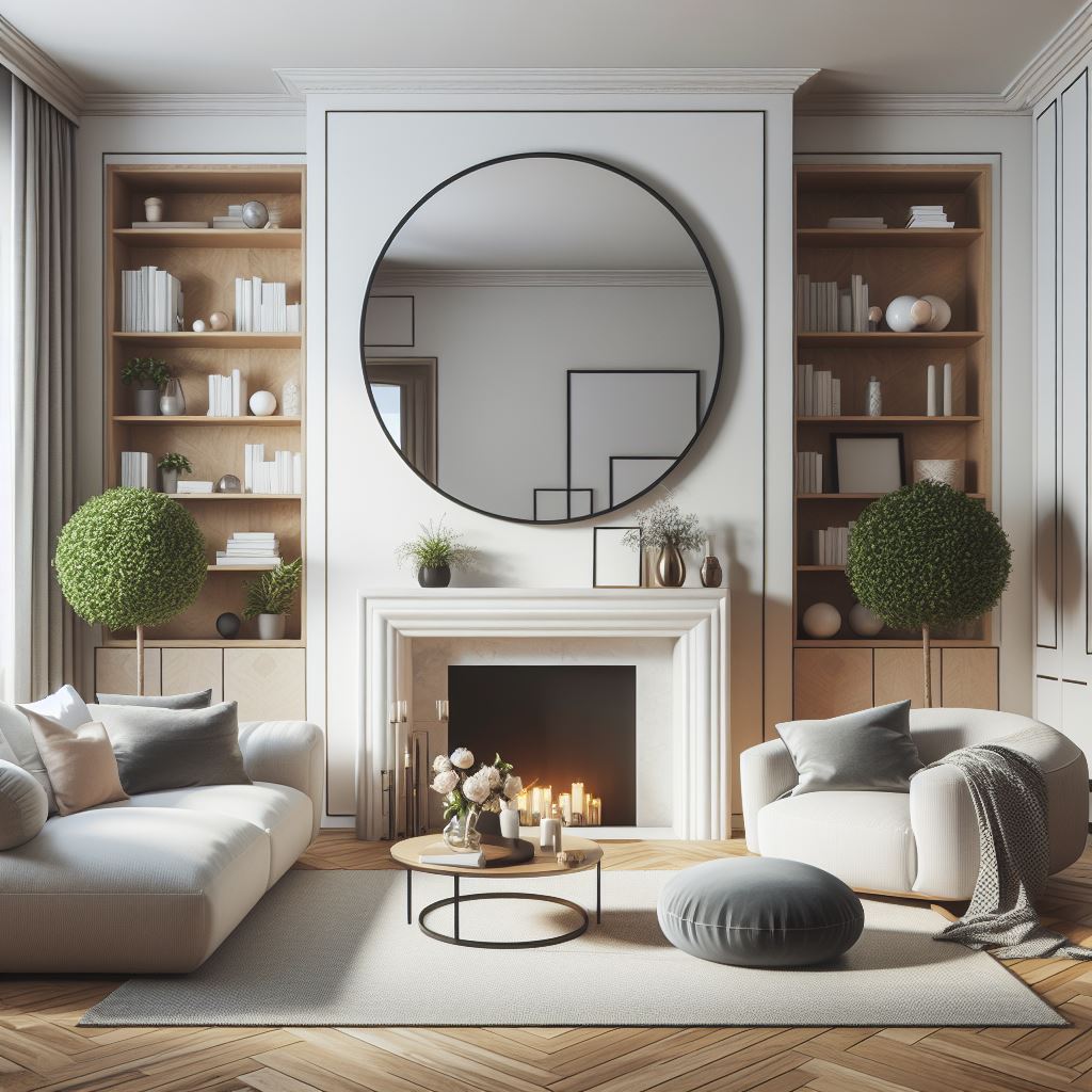 armchair, books, candles, comfortable, couch, cozy, decor, design, fireplace, grey, home, interior, living, mirror, modern, room, round, shelves, white, wood