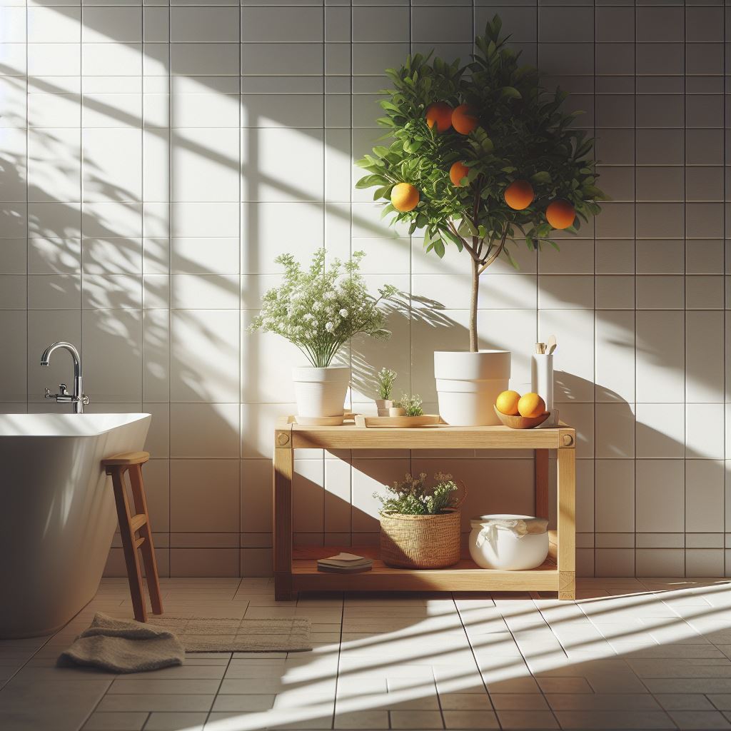 A white bathtub in a sunlit bathroom with tiled walls. An orange tree on a shelf adds color and nature