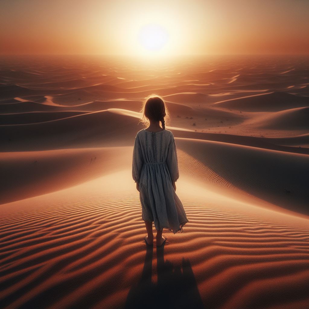 A young girl stands in the desert, facing the setting sun. Her back is to the camera, and she is looking out over the dunes.