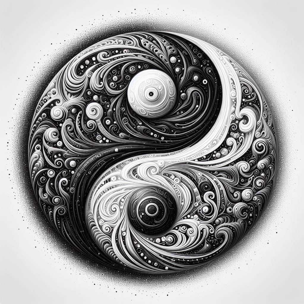 A detailed black and white illustration of a Yin Yang symbol with intricate swirls and patterns.