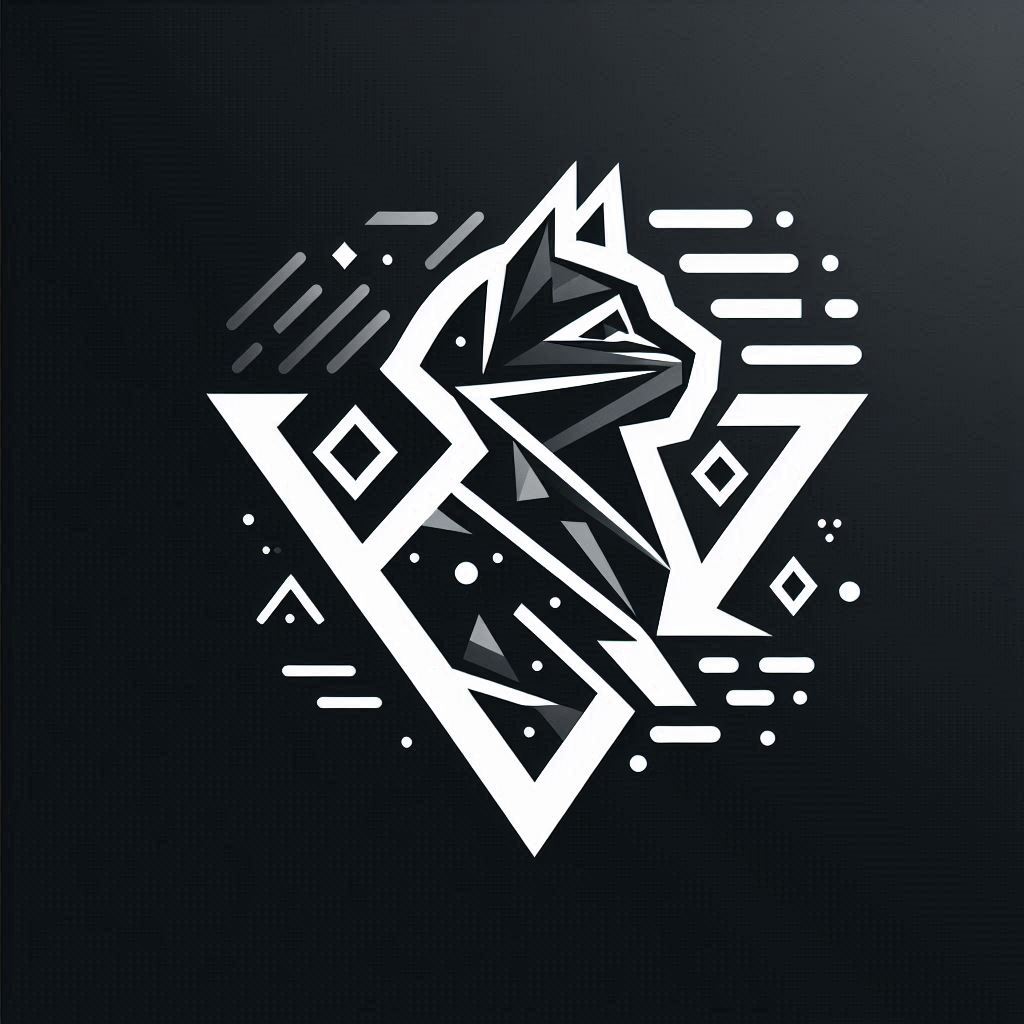 A stylized cat with a geometric design, surrounded by white lines and shapes on a black background.