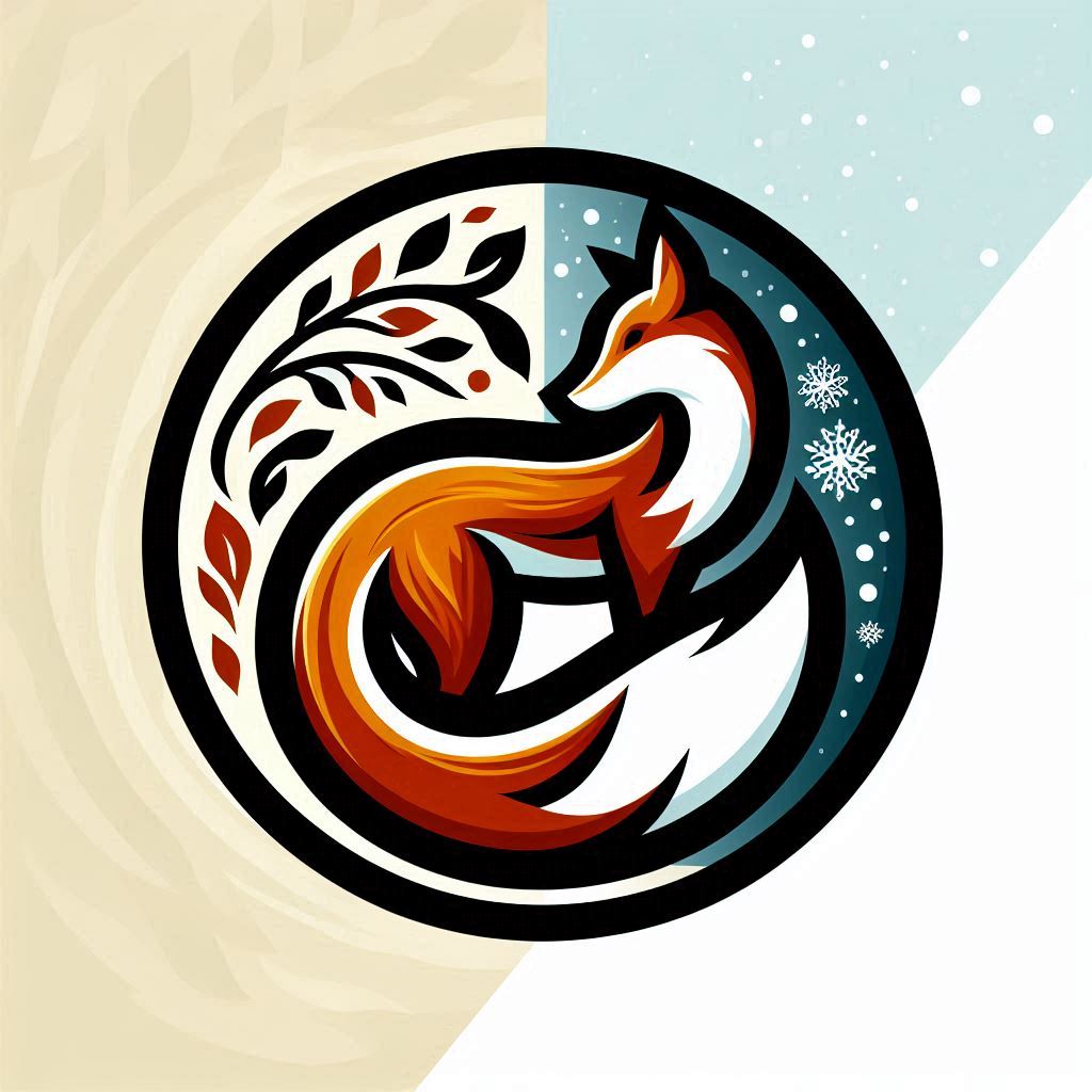 A stylized fox curled around a circle with snowflakes on one side and leaves on the other, representing winter and summer.
