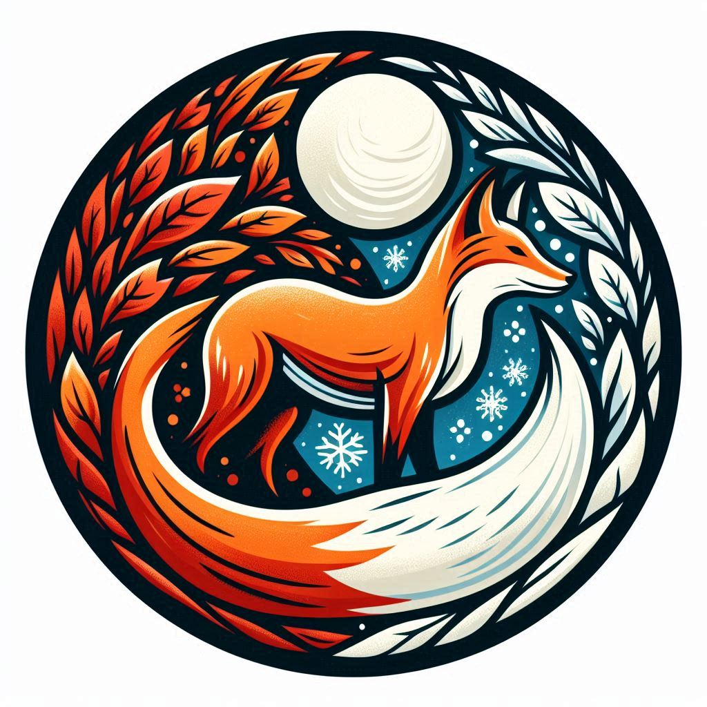 A stylized fox stands under a full moon with snowflakes falling. The fox's tail is wrapped around the moon, creating a circular composition.