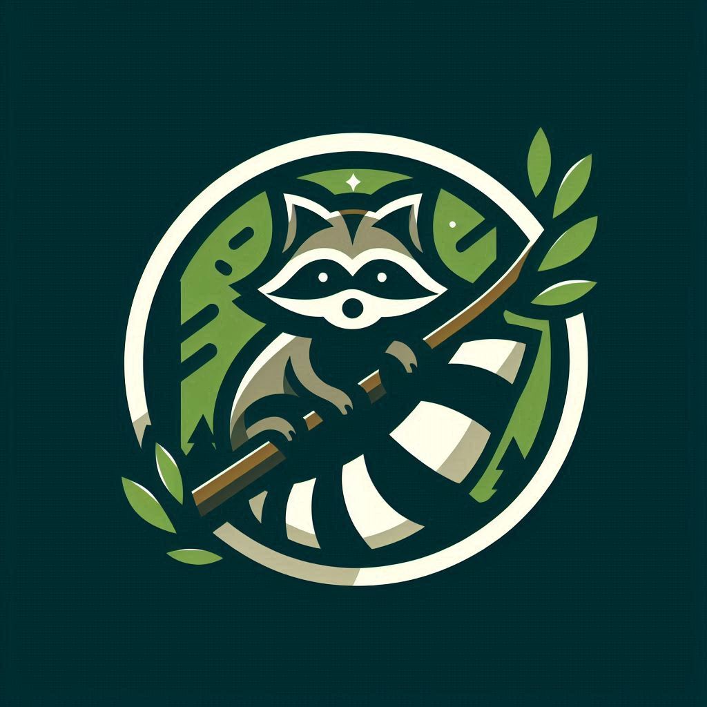 A cartoon raccoon sits on a branch with green leaves, in a circle with a green and white background.