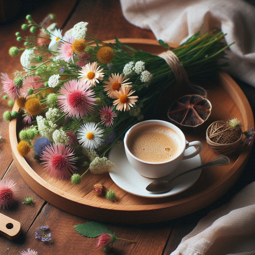 aroma, beverage, bouquet, breakfast, coffee, cozy, cup, dried, flowers, fresh, fruit, light, morning, natural, rustic, table, tea, tray, wildflowers, wooden