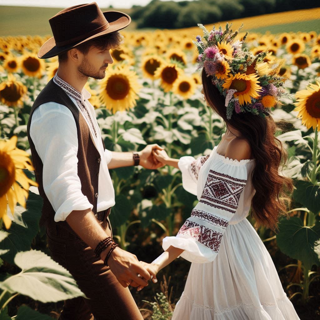 brown, clothing, couple, dance, field, flowers, green, happy, love, man, nature, outdoors, romance, rural, summer, sunflower, traditional, white, woman, yellow