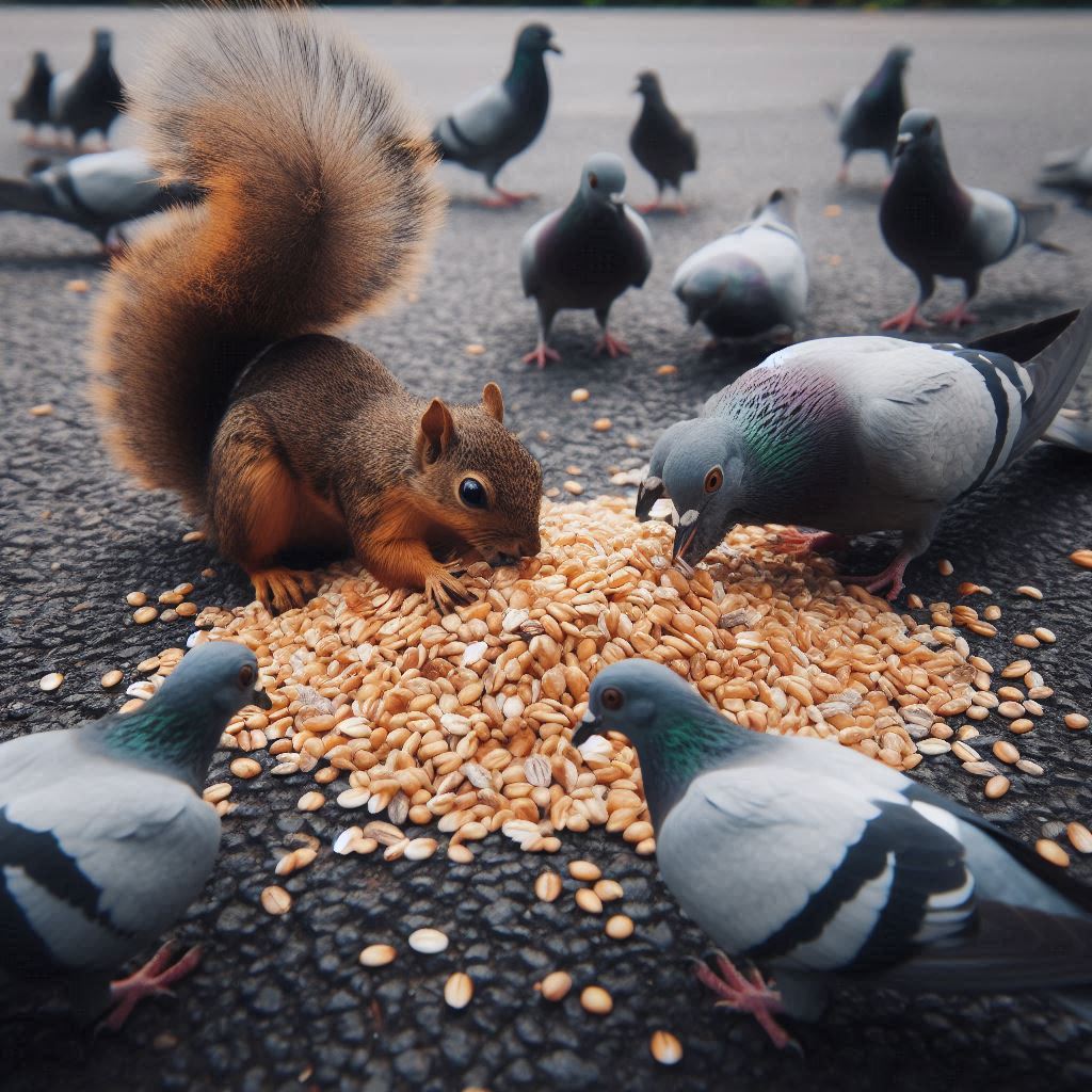 animals, beak, birdseed, brown, city, eating, feathers, food, foraging, gray, ground, nature, pavement, pigeons, sharing, squirrel, street, tail, urban, wildlife