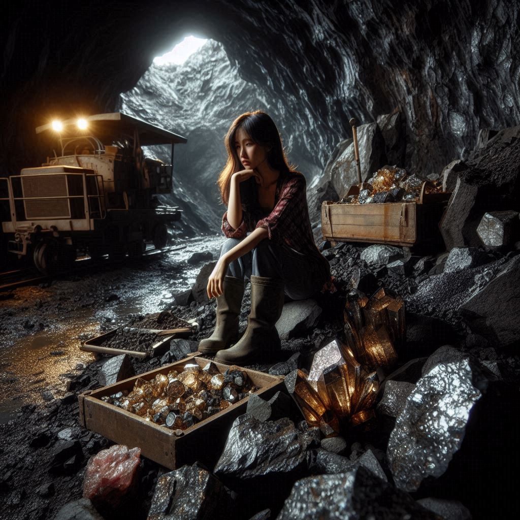 cave, contemplative, crystals, dark, equipment, gems, gold, hard, hat, light, machinery, mine, mining, ore, reflection, rocks, shadow, thoughtful, truck, woman