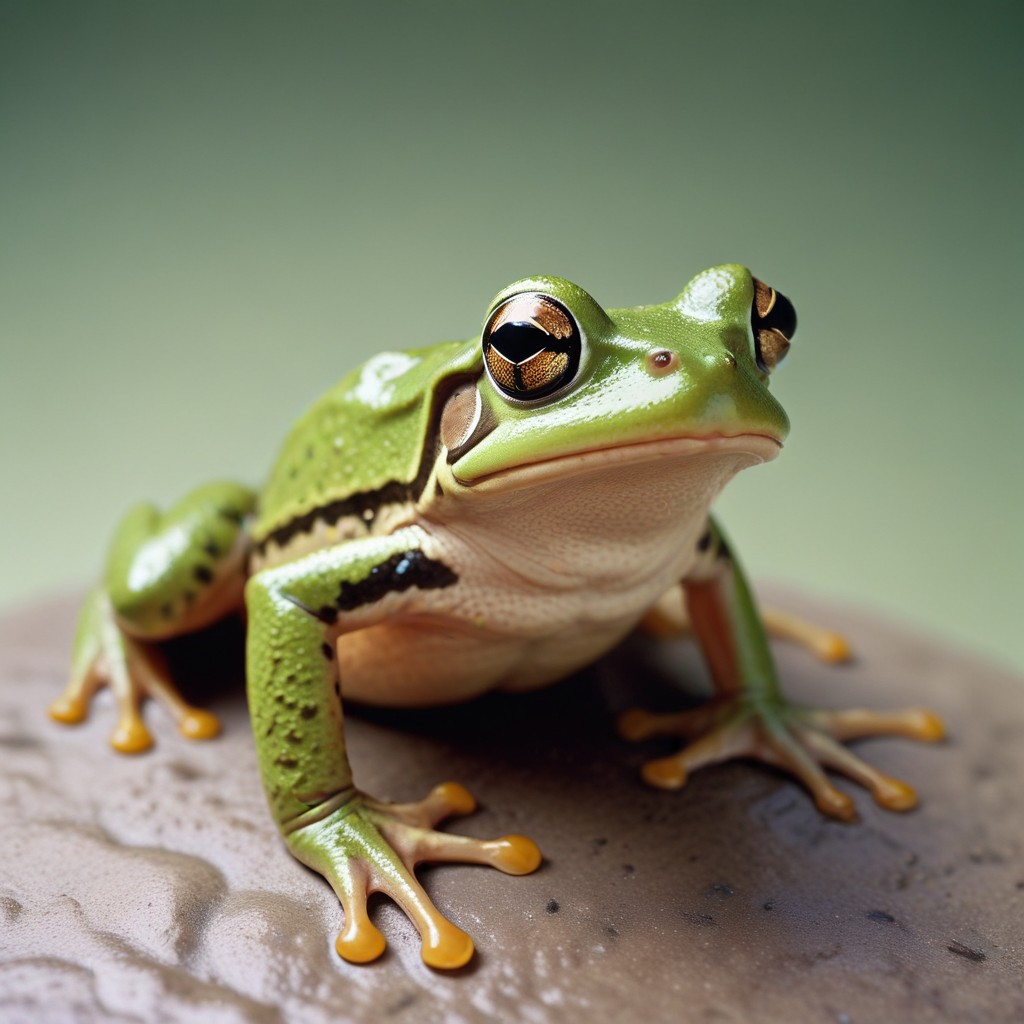 A green frog with black stripes sits on a gray rock, looking directly at the camera.