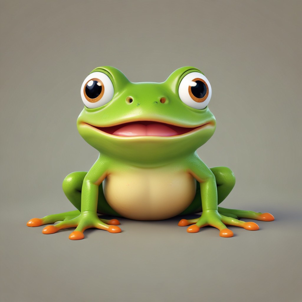 A green frog with large eyes and a wide smile sits on a light grey background.