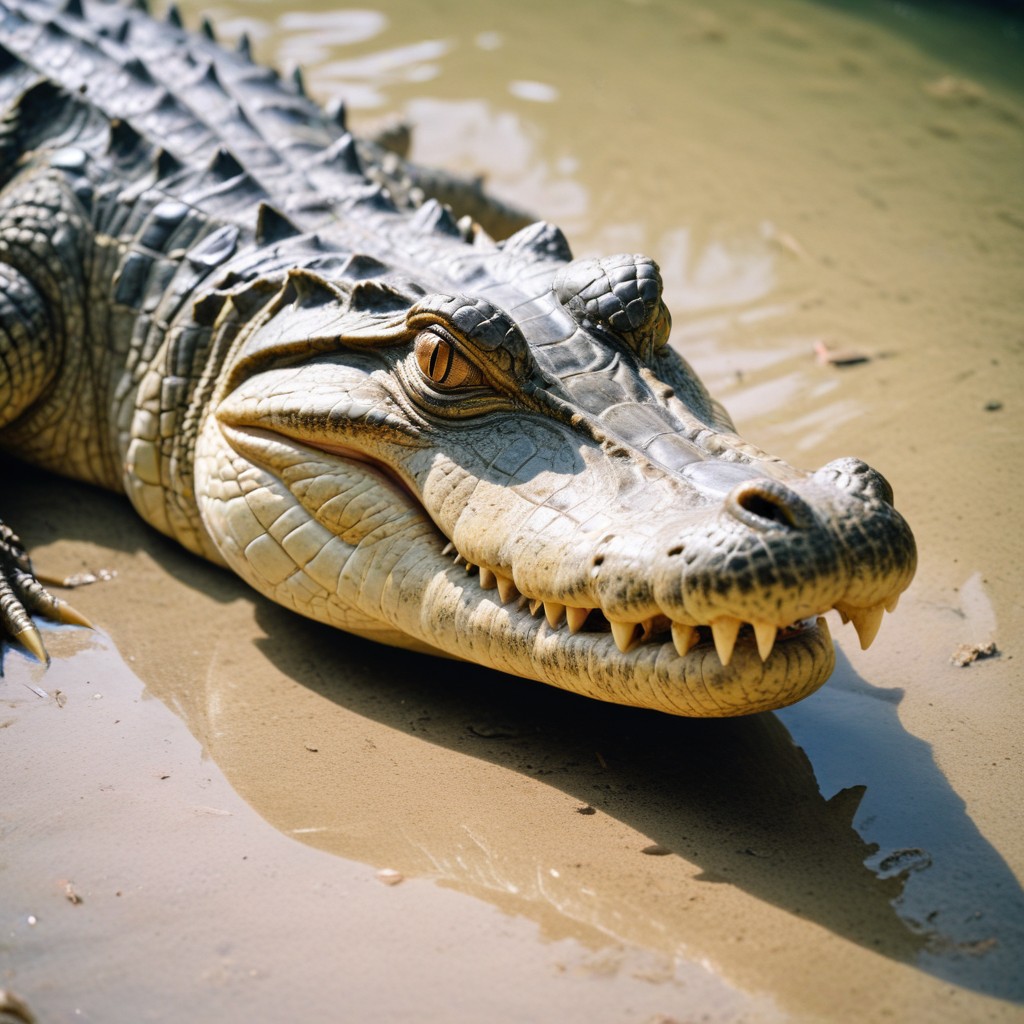 An alligator lies in shallow water, its head and snout visible, displaying its sharp teeth.
