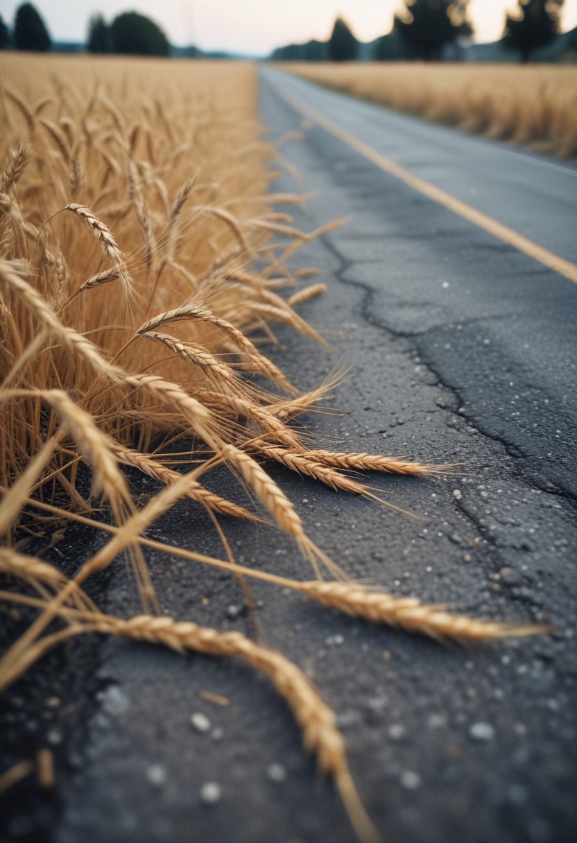 Wheat stalks lie on the edge of a paved road.