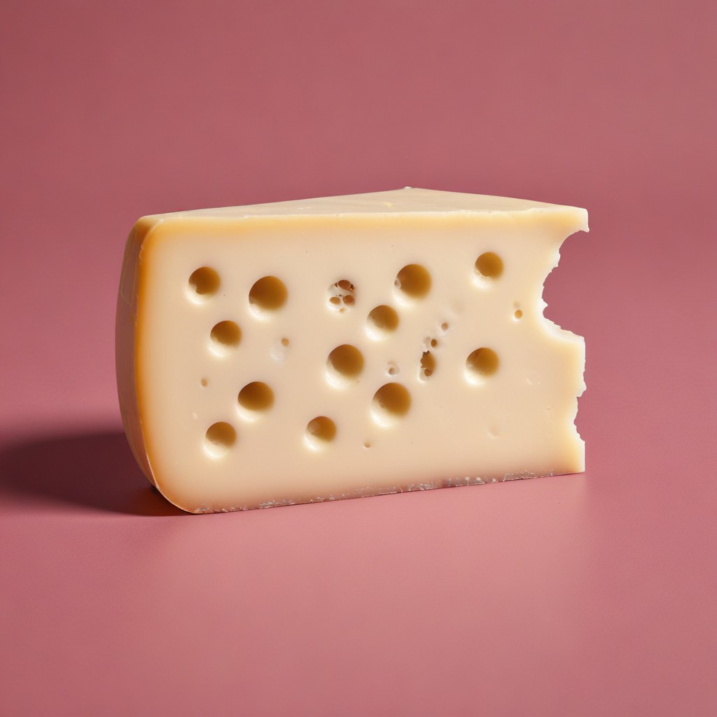 A wedge of Swiss cheese with large holes sits on a pink background.