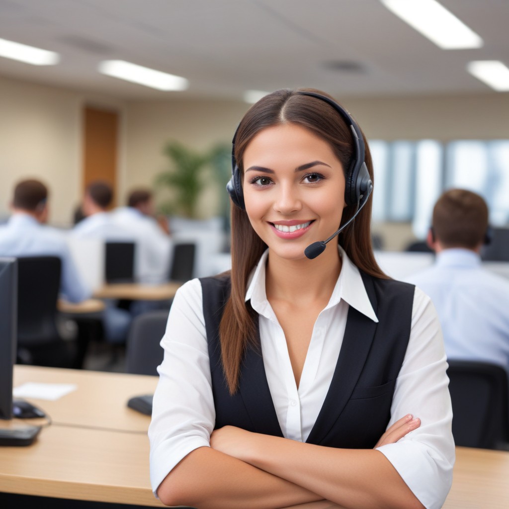 A smiling woman wearing a headset and professional attire sits at a desk in an office setting.