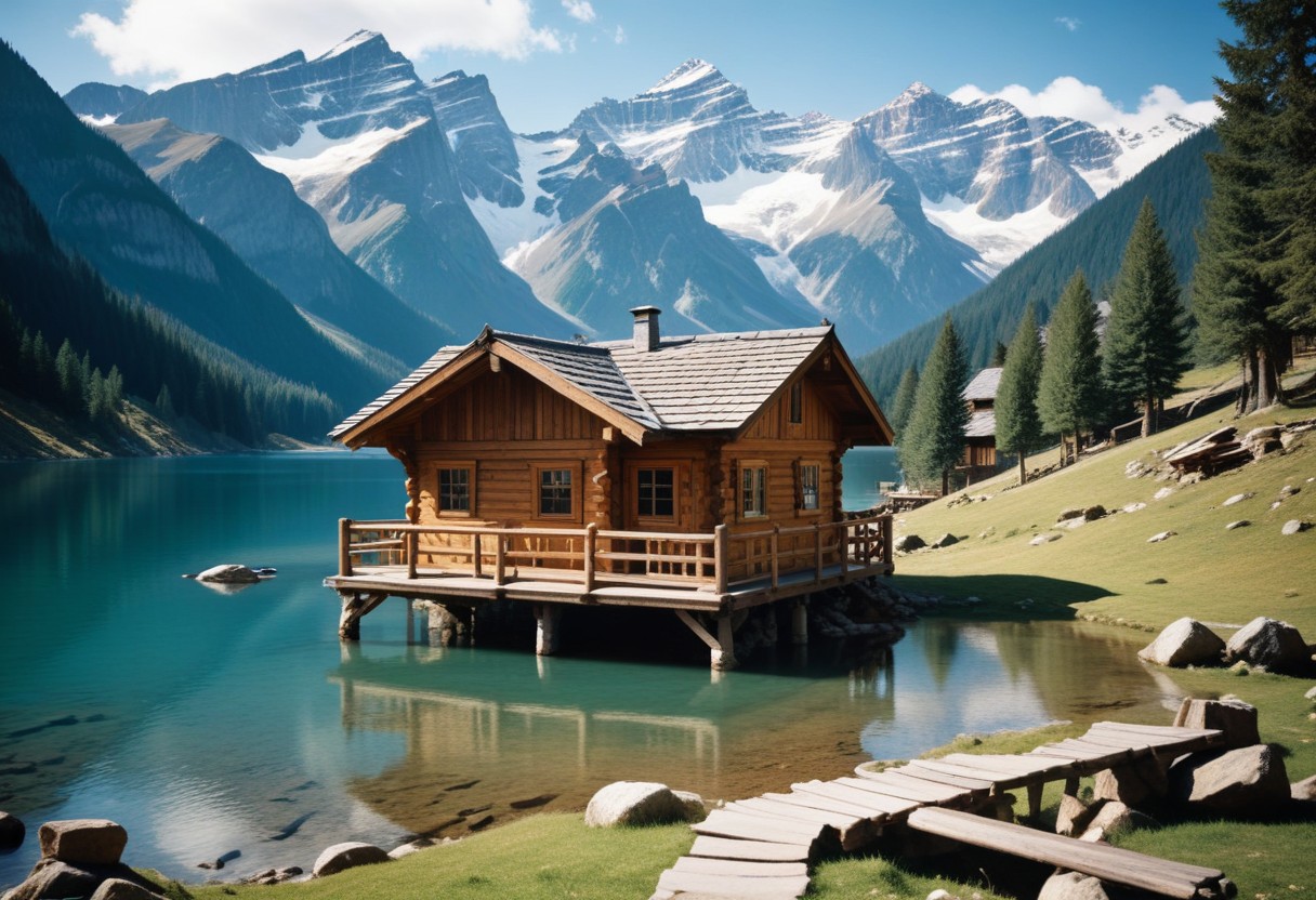 A wooden cabin sits on stilts over a still lake, with snow-capped mountains in the background. A wooden walkway leads to the cabin from the shore.