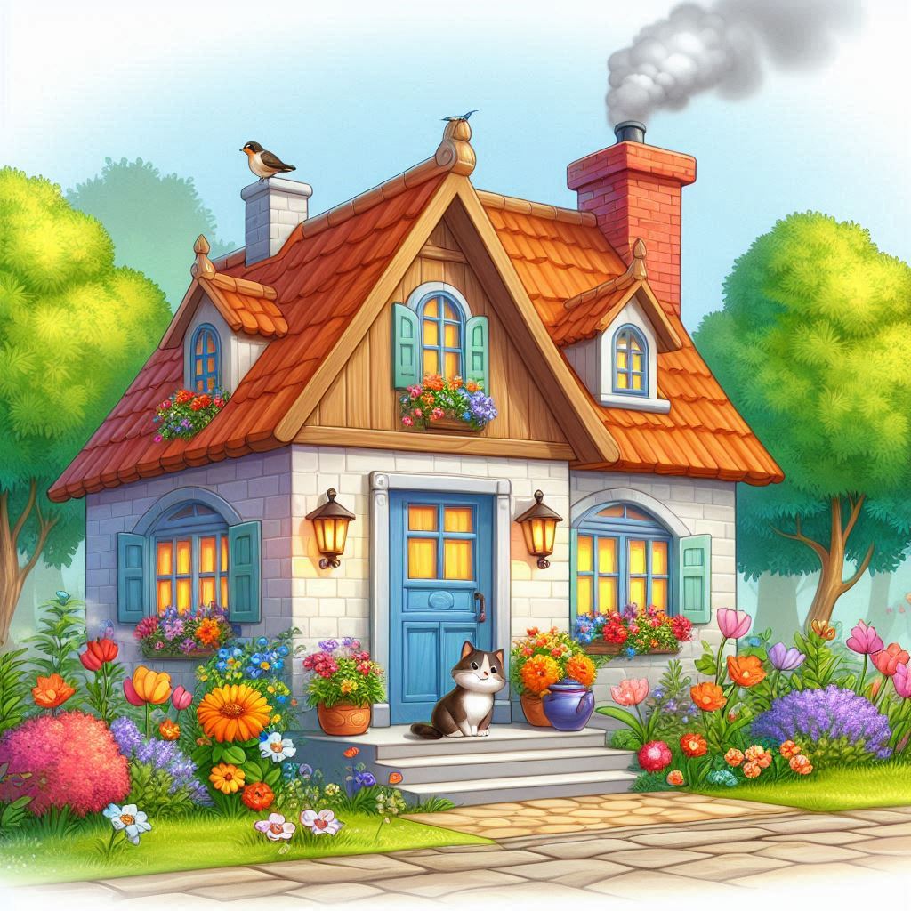 Charming cottage with a cat on steps, colorful flowers, greenery, smoke from chimney - cozy and inviting