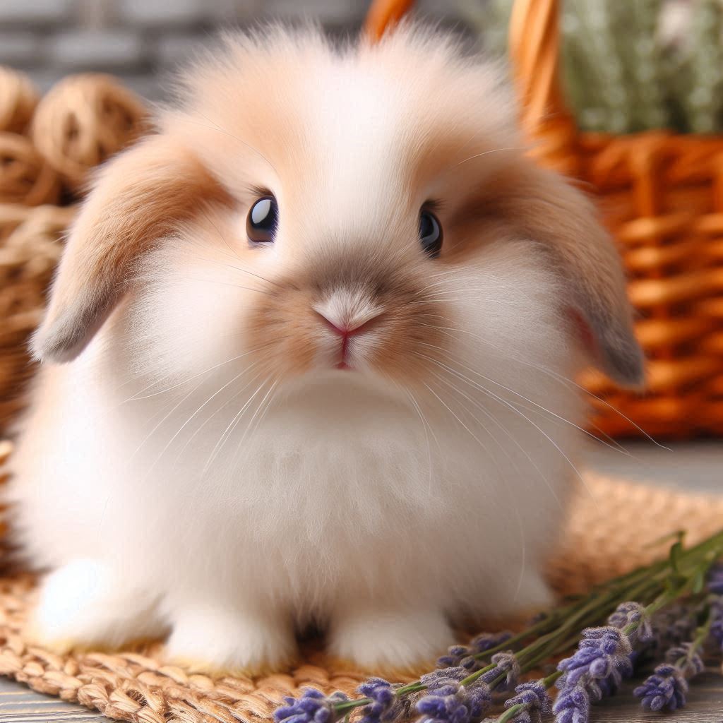 adorable, animal, brown, bunny, closeup, cute, eyes, flowers, fluffy, fur, lavender, mat, nose, pet, rabbit, sitting, small, whiskers, white, woven