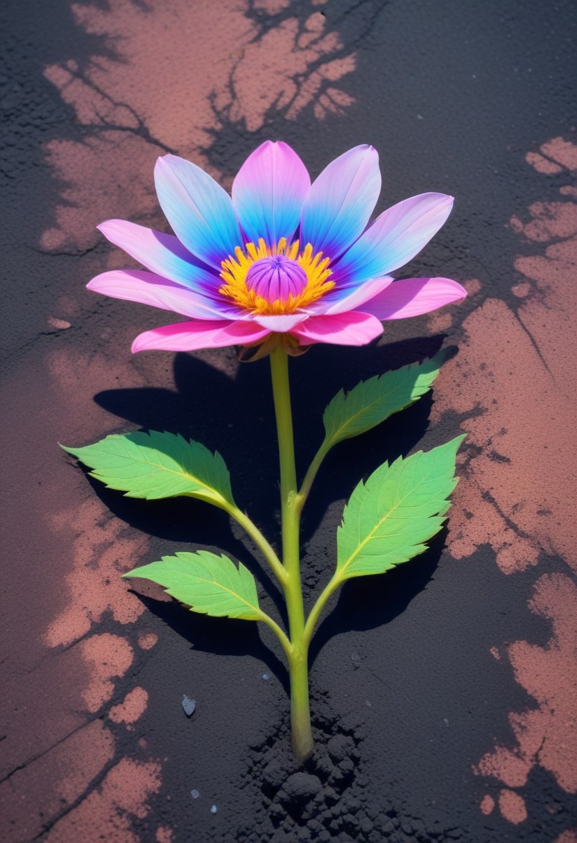 A single flower with pink, blue, and yellow petals grows from dark soil. The flower has several green leaves.