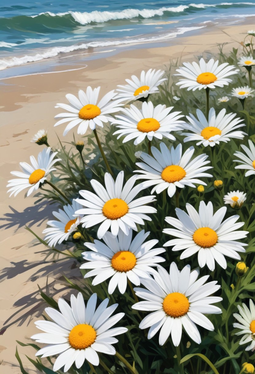 beach, blooms, blossom, closeup, coastal, daisies, day, floral, flower, grass, green, landscape, nature, ocean, petals, sand, summer, sunny, white, yellow