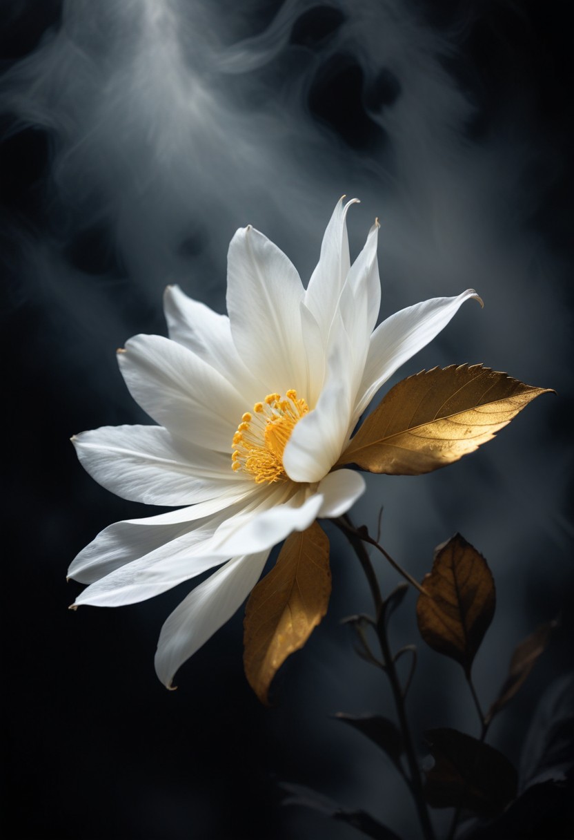 A single white flower with gold leaves stands out against a dark background.