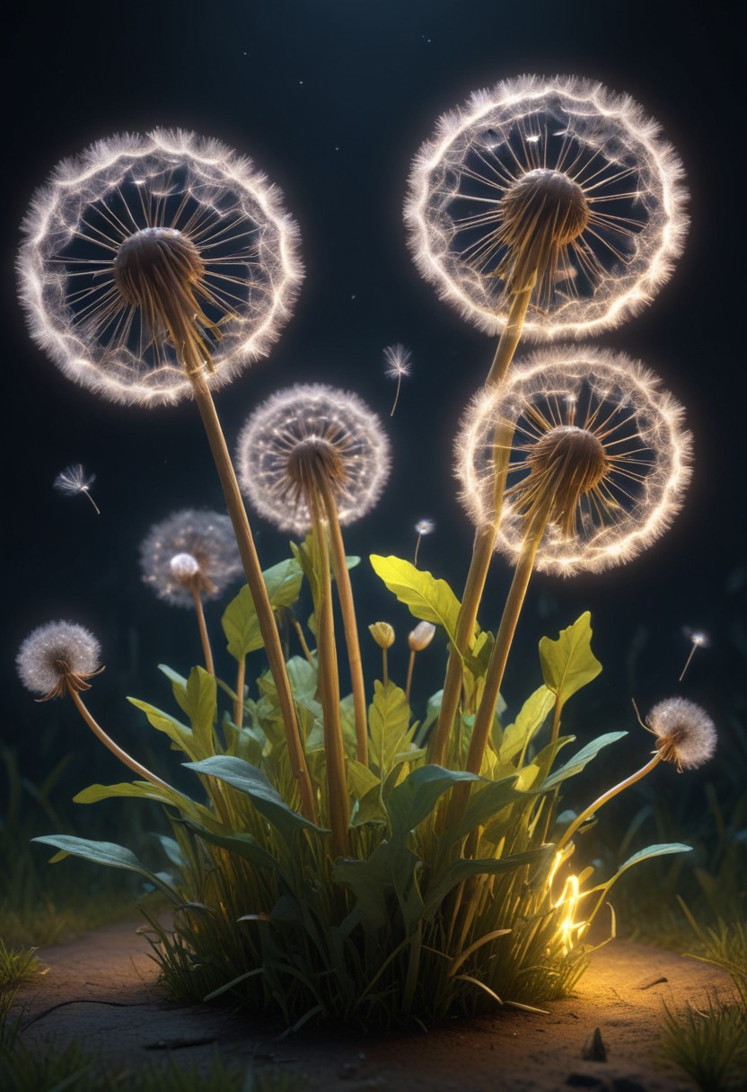 A cluster of glowing dandelion seeds illuminate the night sky as they release into the air.