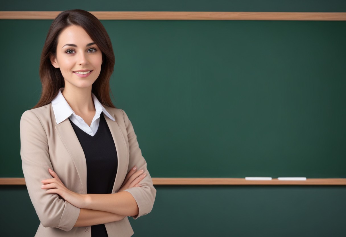arms, chalkboard, classroom, confident, crossed, education, educator, green, instruction, instructor, learning, lecturer, lesson, professional, school, smiling, standing, student, teacher, woman