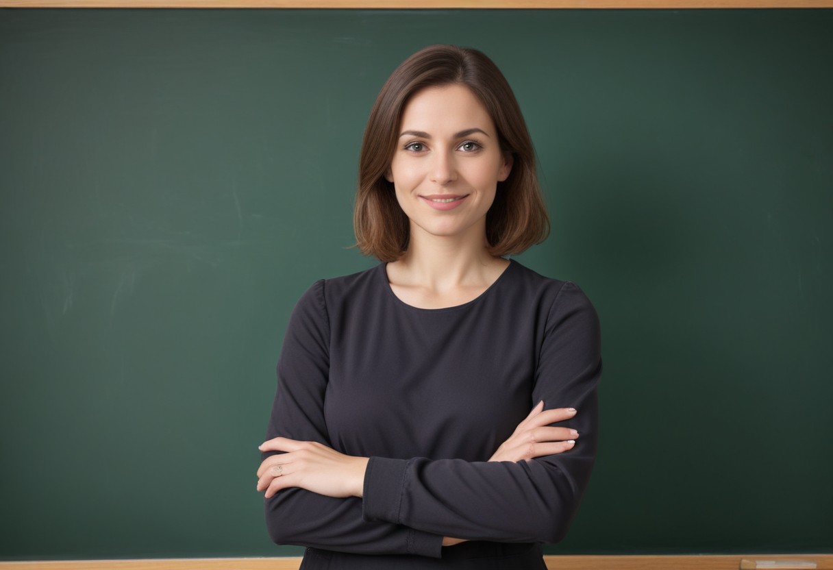A woman with brown hair stands in front of a green chalkboard with her arms crossed. She is smiling at the camera.